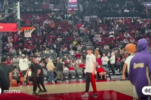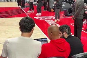 队记:杨瀚森在上场热身前,独自和教练组一起看录像、交流细节