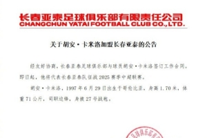 经友好协商,长春亚泰足球俱乐部与球员胡安·卡米洛签订工作合同。即日起,他将代表长春亚泰队征战2025赛季中超联赛。