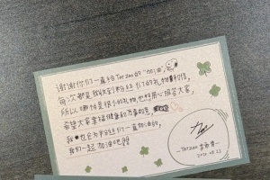 谢谢你们一直给Tarzan的加油。每次都是我收到粉丝们的礼物和信,所以哪怕是很小的礼物,也想用心报答大家。希望大家幸福、健康和万事如意。我也会为粉丝们一直加油的。我们一起加油吧!!