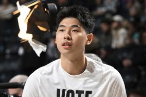 努力坚持!杨瀚森赛前热身与助教直接交流 场上可以摆脱翻译了
