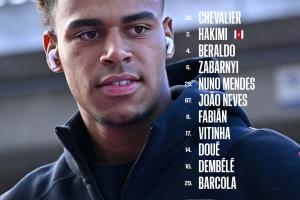 30-舍瓦利耶、2-阿什拉夫、4-贝拉尔多、6-扎巴尔尼、25-努诺-门德斯、87-若昂-内维斯、8-法比安-鲁伊斯、17-维蒂尼亚、14-杜埃、10-登贝莱、29-巴尔科拉