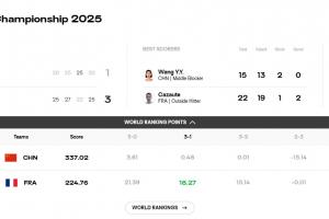 此役过后,中国女排损失18.27分,世界排名下跌2位至第7,法国女排世界排名上升1位至第13。