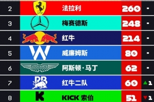 车队积分榜方面,迈凯伦324分优势领跑,红牛二队升至第7。