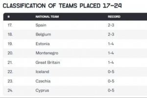 本届赛事17到24名的排名也最终确定,分别是西班牙、比利时、爱沙尼亚、黑山、英国、冰岛、捷克和塞浦路斯。