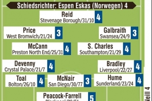 中场:德文尼(4)、麦卡恩(4)、查尔斯(4)、布拉德利(4)、艾萨克-普莱斯(3)、加尔布雷斯(3)