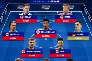 中场:格拉利什(英格兰,2800万欧元)、霍尔(英格兰,2000万欧元)、贝林厄姆(英格兰,1.8亿欧元)、赖斯(英格兰,1.2亿欧元)、内贝尔(德国,2400万欧元)