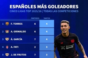 体育资讯9月23日讯 德国转会市场统计了五大联赛西班牙球员本赛季的进球数量,并列出榜单,费兰-托雷斯、格里马尔多、A-加西亚4球居首。