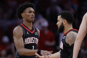 汤普森是唯一能合理地在首发阵容中担任主控手的球员。他无法投篮的弱点会让对手在掩护中放他几米远,并赌他无法在无球状态下击败他们,而且如果火箭想重用申京-亚当斯的组合(就像他们上赛季末段那样),场上空间可能会变得异常糟糕(也就像上赛季末段那样)。