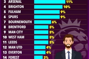 调查结果揭示了明显的南北着装差异,榜单前七名均被来自伦敦和南部的球队包揽。曼城、利兹联、布伦特福德和西汉姆联以5%的数据并列第八。