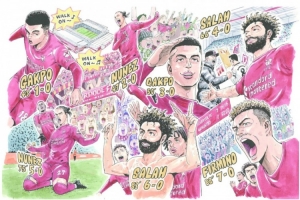 他的插图将利物浦那场历史性比赛中的七次庆祝画面与欢腾的安菲尔德球场背景相结合。 球迷们很快就能在即将推出的安菲尔德球场新讲谈社角(Kodansha Corner II)近距离欣赏到这幅独特的作品。