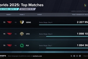 体育资讯10月21日讯 数据网站Esports Charts发布了S15瑞士轮目前的观赛数据;