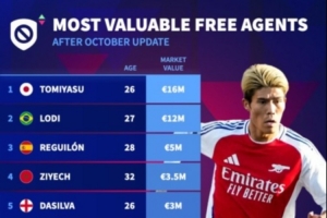 体育资讯10月21日讯 德转更新自由球员身价排行榜,富安健洋1600万欧居首,雷吉隆、齐耶赫、帕科位居前十位。