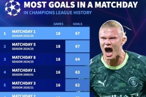 欧冠比赛日进球数量排名:
