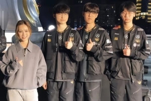 邓紫棋与T1全队合影,紧挨Faker占据C位,表示很开心来唱主题曲