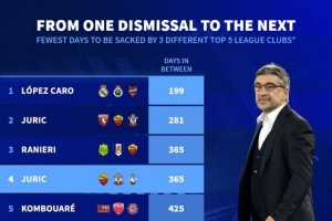 本世纪五大联赛最短时间被三家俱乐部解雇榜:前4名尤里奇独占2席