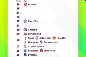 一目了然!英超积分榜:阿森纳狼队“断层” 5队同积18分挤在一起