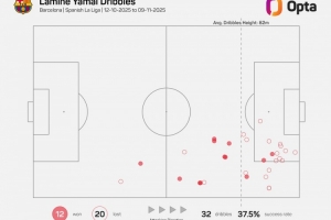 10月休赛期之后亚马尔尝试过人32次五大联赛最多,成功率37.5%