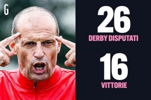 据米兰体育报数据统计,米兰主帅阿莱格里此前共26次带队出战米兰德比(米兰)以及都灵德比(尤文),战绩为16胜5平5负。