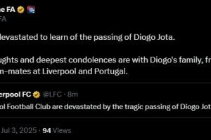 英足总写道:“惊悉迪奥戈-若塔离世,我们深感悲痛。谨向迪奥戈的家人、朋友,以及他在利物浦俱乐部和葡萄牙国家队的队友致以最深切的哀悼。”