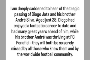 因凡蒂诺写道:“惊闻迪奥戈-若塔与其兄弟安德烈-席尔瓦不幸离世,我深感悲痛。年仅28岁的迪奥戈已拥有辉煌的职业生涯,未来本应更加璀璨,而其兄弟安德烈也在佩纳菲耶尔俱乐部崭露头角。”