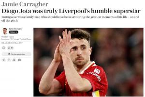 体育资讯07月03日讯 利物浦名宿卡拉格在其电讯报专栏撰文,悼念刚刚去世的利物浦前锋若塔,以下为文章编译。