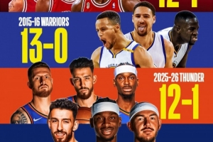 70胜有戏!雷霆前13场12胜1负追平72胜公牛 73胜勇士前13场全胜
