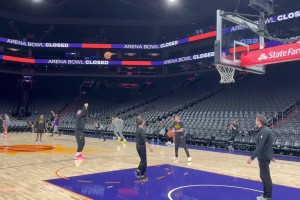 张子宇热身将双手扣在篮板上拉伸赛中包夹她的防守人无奈笑了