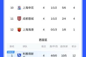 包揽倒数前三!亚冠积分榜:海港4轮1分垫底,蓉城申花倒数二三