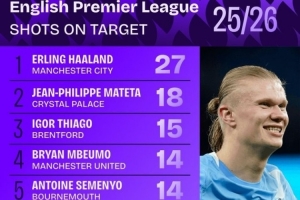 本赛季英超射正榜:哈兰德27次领跑,姆伯莫、恩佐、佩德罗在列