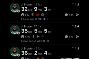 大当家!杰伦-布朗过去五场比赛四场砍下30+ 赛季场均28.1分
